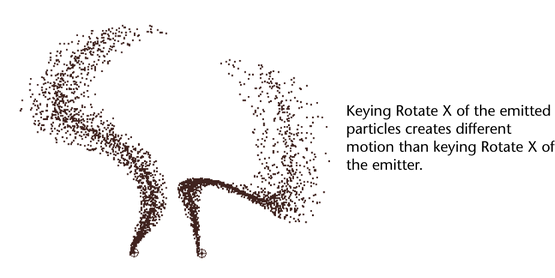 When you manipulate the Translate or Rotate attributes of an emitter, you have no influence on the position of particles after emission. For example, suppose you create a stream of smoke emitting upward. If you key the Rotate X attribute of the emitter, the emitted particles do not rotate after emission. They maintain the direction they had when first emitted.