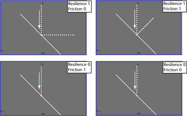 A value of 0 means that particles are unaffected by friction. A value of 1 makes particles reflect straight off along the normal of the surface. If Resilience is 0 while Friction is 1, the particles don’t bounce.