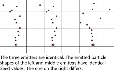 The default value for each Seed entry is the same (1), so if you want two identical emitters to emit to different positions, you must set one of the Seed values to a different number. A new Seed value takes effect only after you rewind. When you change the Seed used by one emitted object, you won’t alter any other emission in the scene.
