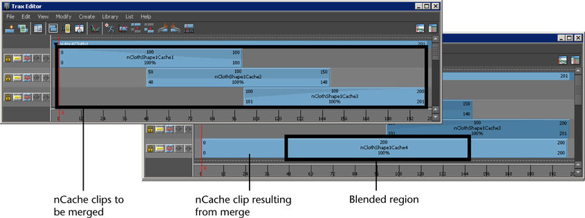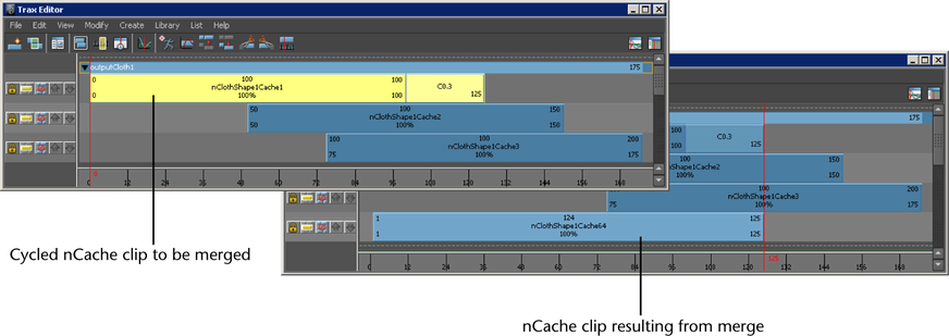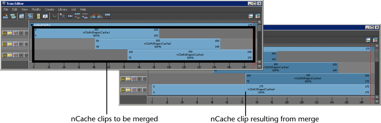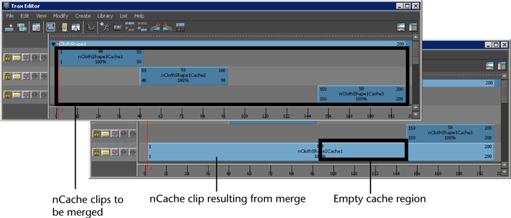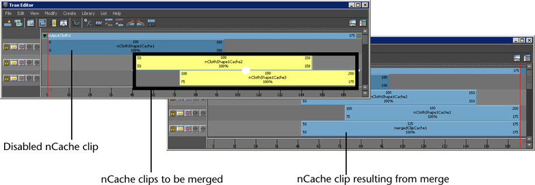 You can merge your nCache clips into a single new cache clip. The cache clips you want to merge can be positioned sequentially in a track or can be located on different tracks. You cannot merge disabled nCache clips.
