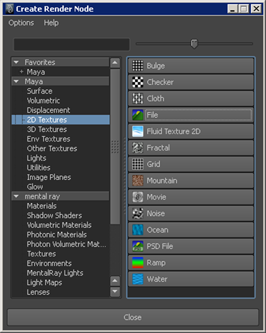 - In the Create Render Node window, under Maya, select 2D Textures from the list.