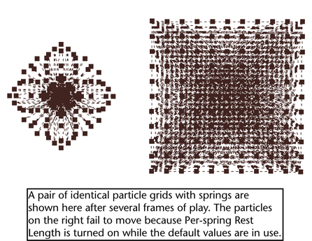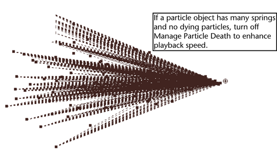 Do not turn off Manage Particle Death if any particles in the object die. Springs attached to the particles won’t work correctly. This is true if particles have ever died in the object. If you set current attribute values of the particles for initial state operation at a point where no more particles die, you still must not turn off Manage Particle Death.