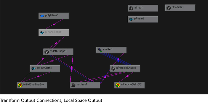 The output connections of the Transform node are dependent on the space output of its nCloth. If your nCloth has Local Space Output, both its input and output meshes share the same Transform. Also, the nCloth’s input mesh moves and follows its output mesh when the output mesh is transformed.
