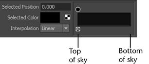 You define the reflection colors between the top and bottom of the sky by adding position markers to the ramp and changing the color at the markers. See Set fluid attribute ramps.