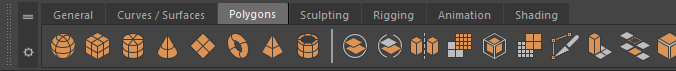 The default shelves are divided into tabs that represent each main tool set in Maya. Each tab contains icons that represent the most commonly-used commands for each set. For example, the Rigging tab contains icons for the mostly commonly-used commands available in the Rigging menu set.
