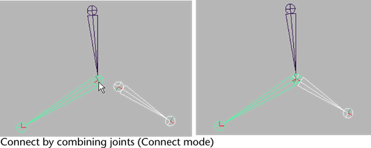 You can also connect the joint of one joint chain or the root of one skeleton to any joint of another joint chain or skeleton by extending a bone from a joint on the joint chain or the root from the skeleton to a joint or the root joint of another joint chain or skeleton. The joint chain or skeleton that becomes part of the other joint chain or skeleton does not move to the other chain’s or skeleton’s position.