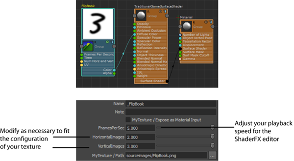 Select the Flip Book node, and modify the HorizontalImages and VerticalImages attributes to fit the configuration of your texture.