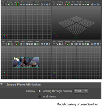 You can choose to display your free image plane in all views; or, only through a specified camera. The drop-down list beside the Display > looking through camera allows you to select the camera through which the image plane is displayed.