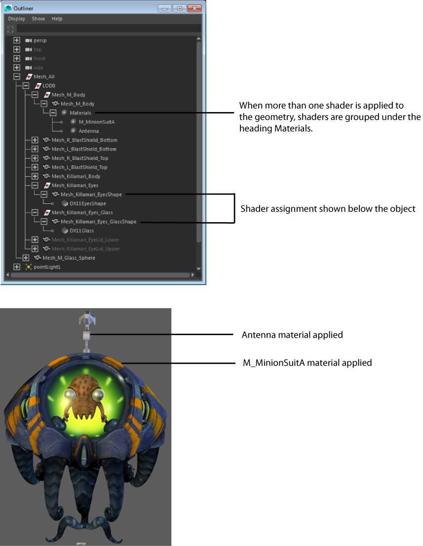 Display the shader assigned to each object in the scene by enabling the Display > Assigned Materials option in the Outliner.