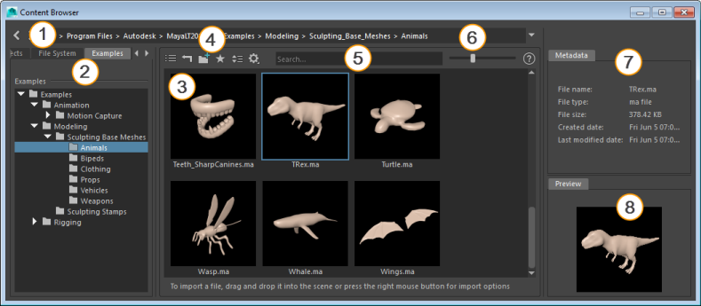 Display the files in the selected folder - see Find and import files from the Content Browser for information. Click the icons above this panel (4) to manage its contents. |