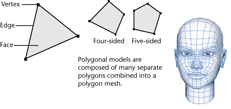 An individual polygon is commonly called a face, and is defined as the area bounded by three or more vertices and their associated edges. When many faces are connected together they create a network of faces called a polygon mesh (also referred to as a polyset or a polygonal object). You create your 3D polygonal models using polygon meshes. Polygon meshes can be created using a variety of techniques. For more information on these techniques see Polygon modeling overview.