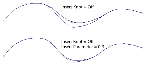 This option is available only when you use the Blend option. In conjunction with the Insert Parameter value, Insert Knot lets you match the blend region to the original curves more closely.