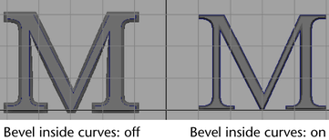 Turns on beveling inside the curve rather than outside it. Turning this option on gives you greater control over the overall size of the beveled surface since you are guaranteed the resulting surface will be no larger than the original curve.