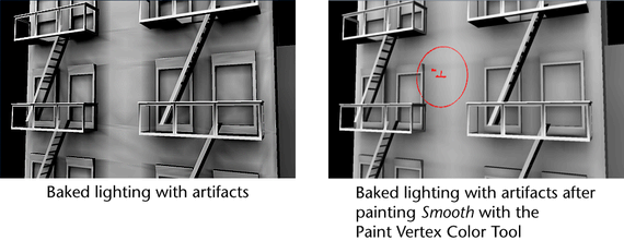 You can also touch up your baked lighting results by painting vertex colors directly into your color sets. The Paint Vertex Color Tool lets you remove, replace (darken or lighten), or smooth the lighting baked on your vertices. See Assign colors to polygon vertices by painting.