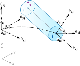 The longitudinal axis of the elements is straight, so that when modeling curved beams, they provide a "faceted" approximation to the true geometry. Currently, the beam is assumed to have a circular cross-section of constant radius. However, the cross-sectional radius of adjacent elements may be different.