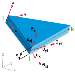 The geometry, node numbering and local/global degrees of freedom for the element are shown in The LBT3 Shell Element. Note that nodes i, j, k refer to entries in the nodal connectivity table given in the analysis output file. For example, if the connectivity for an element is 11, 101, 85 then i = 11, j = 101, k =85, and the local X-axis runs from node 11 to node 101.