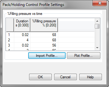 To help speed up data entry and minimize errors that might occur during manual data entry, you can now import tabulated data for the packing profiles and velocity profile dialogs from *.csv files.