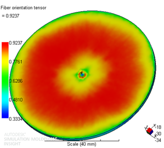 In addition, the way in which the 3D Flow solver calculates the fiber orientation profile has been improved. The fiber inlet profile at the gate is now better preserved, resulting in a more accurate fiber orientation profile at the injection node, particularly for coarser meshes.