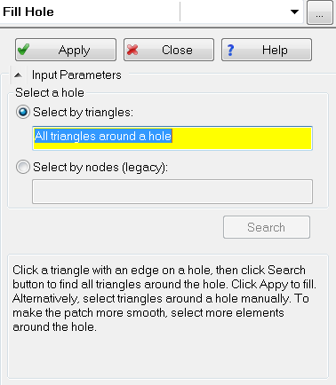 Select triangles around a hole and fill the hole with triangles of similar edge length. Select one triangle, then click Search to find all triangles around the hole. The initial triangle should have at least one edge on the hole. Alternatively, select all the triangles around a hole, manually. Selecting more triangles may make the filling patch smoother.