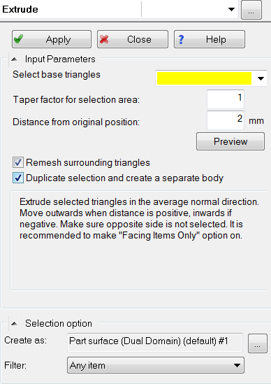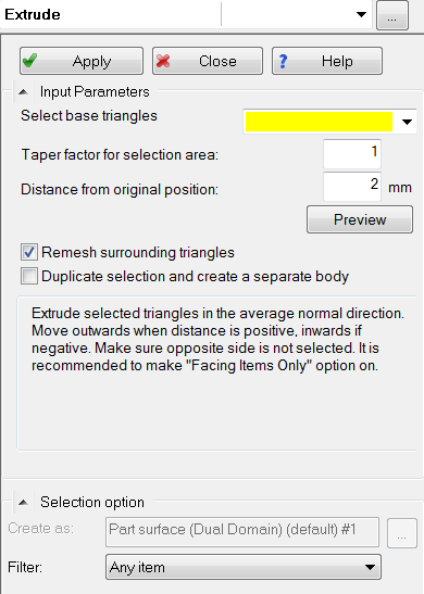 Select triangles and specify the distance you want to move them from their original position. When the distance is positive, triangles move outwards. When the distance is negative, triangles move inwards. When Remesh surrounding triangles is on, all new triangles on side faces are remeshed, based on the average edge length in the selection area. When it is off, a minimum number of triangles are created on the side faces to connect with the rest of the mesh. Click Preview to make sure that the move direction and distance are correct. Preview does not include remeshing of surrounding triangles.