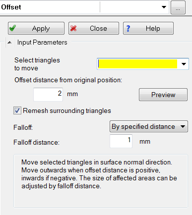 Click Preview to make sure that the offset direction and distance are correct. Preview does not include remeshing of surrounding triangles.The falloff distance is the dimension of the affected area around the offset. Select By specific distance and enter then the Falloff distance to define this area.