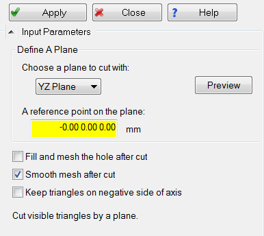Select XY, YZ, or XZ as a plane to cut the visible mesh. The selected plane is displayed for preview purposes. Specify a reference point to define the position of the plane. Click a point on the mesh to fill the coordinates or enter it manually. Then click Preview , to see the update of the plane.