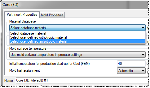 An injection overmolded design can involve fiber reinforced composite inserts of very complex geometries and double curved surfaces, such as from a thermoforming or draping process. As a result, the fiber sheet direction, and thus the composite principal directions, vary according to the insert surface normal and any in-plane shear which has occurred during forming. For accurate simulation, it is critical that you define the local material axes correctly in the Anisotropic properties dialog. You input the vectors for the first and second local axes, and Insight automatically calculates the third local axis. The first and second local axes must be orthogonal to each other.