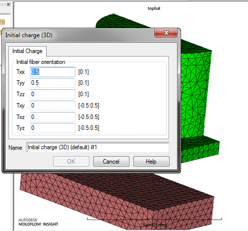 In prior releases, the three initial fiber orientation values that you entered for the initial charge were for the diagonal terms of the 2nd-order orientation tensor, assuming 0 for the off-diagonal terms. As such, (0.5, 0.5, 0) represented a random orientation in the XY plane. This implementation was to enable you to specify whether the initial orientation was 2D random (typically in SMC), or 3D random (typically in bulk molding compound).