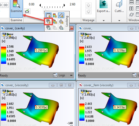 The Examine tool is used to determine the exact value of a result at a specific location on the model. The Lock All Views tool is used when comparing multiple studies, to lock all views so that however you manipulate the model in one study the change is replicated in the models for all the other studies you are viewing. You can now combine the Examine tool with the Lock All Views tool to see the value of a result at the same specific location on the models.