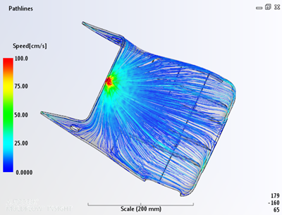 Attention: The pathline plot has a dependency on both mesh density and velocity results. In order to get suitable coverage of pathlines for complex analyses, the mesh density and number of solver outputs may need to be increased. This is particularly evident in analyses that involve inertia and/or jetting.