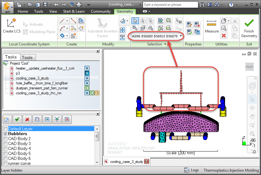 Beam elements are two-noded elements used to represent runner system components, cooling channels, gas channels, and tapered or non-tapered structural beams on the part.