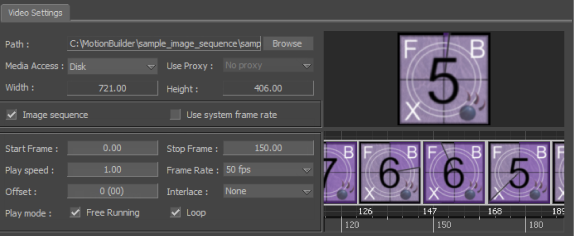 | Free Running | Specifies the loaded video file as free running. Free Running plays the video file automatically, without the need to use the Transport Controls window. |