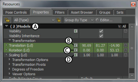 Properties window A. Two objects selected B. Translation of both objects keyed at the current time C. Rotation of one object keyed at the current time D. Neither object has a keyframe for scaling at the current time