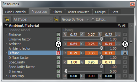 Properties window A. Keyframe button B. Animate button