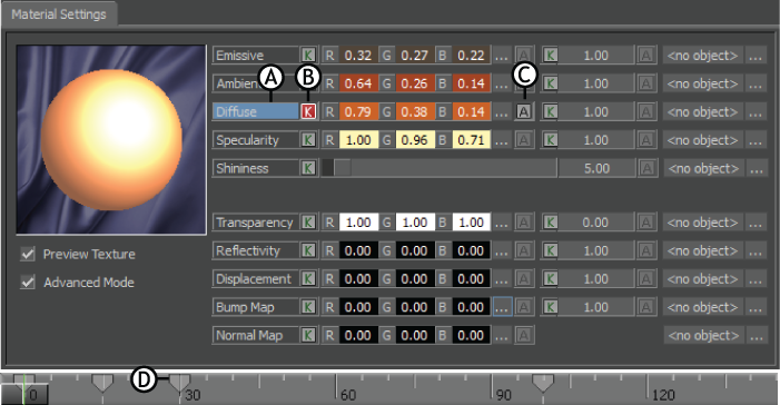 Asset Settings area A. Diffuse property selected B. Keyframe button C. Animate button D. Keyframes of Diffuse animation on the Action timeline