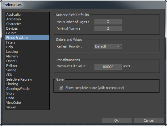 In the Preferences window, the Fields and Values preferences consist of numeric field default settings, sliders and values default refresh rate settings, the maximum number you can enter into a value field in the FCurves window, and the option to display names to include namespaces.