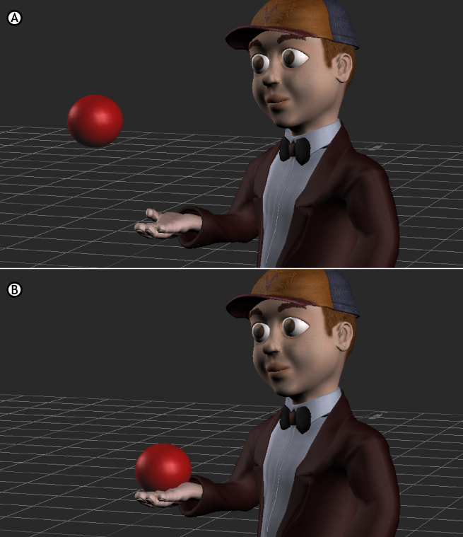 Use this constraint to connect objects without changing hierarchies or making hard connections. For example, in the following figure, a model’s hand effector is parented to a child-object sphere. Once the constraint is activated, any movement of the parent “hand” also occurs for the “ball” child in this way you can connect an object to the hand of a model without changing the model’s hierarchy.