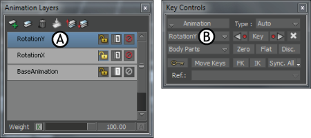 Renamed layer A. “Rotation Y” layer selected in the Animation Layer editor B. Selected layer displayed in the Layer field