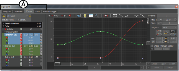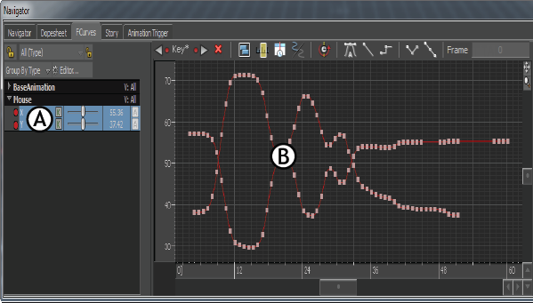 A. FCurves Properties paneB. FCurves pane displaying the data recorded to the X- and Y-axes of the device
