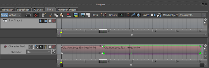 The second half of the original Clip_Run_Loop.fbx clip is highlighted in green indicating it is selected.