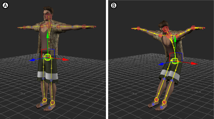 Effector pinning A. Character with wrists and ankles pinned in translation and rotation B. The wrists and ankles remain in place even when the Hips are translated along the Z-axis.