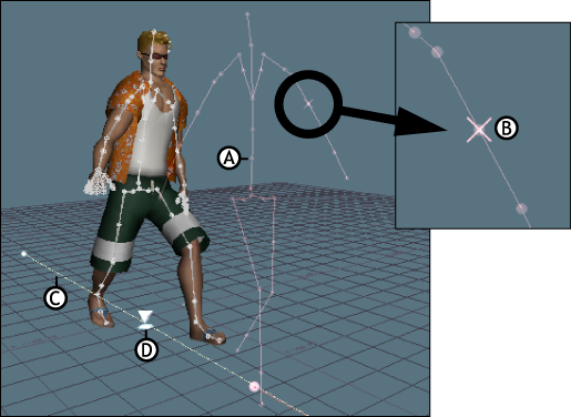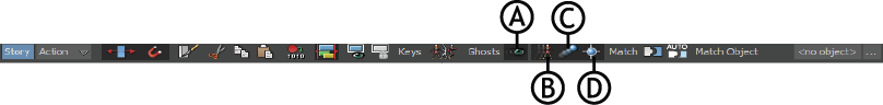 Ghosts options in the Story window A. Ghost option B. Model option C. Clip Vector/Travelling Node option D. Match Object option