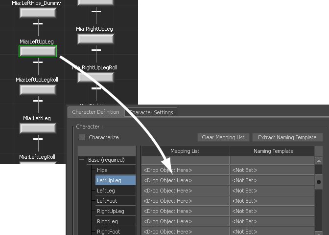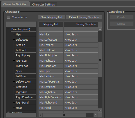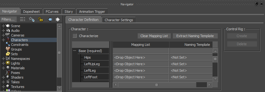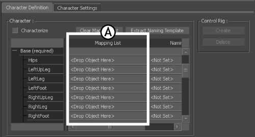 This group of nodes is required for MotionBuilder to recognize the structure of your character model. If you had automatically characterized this character, the Mapping list would be populated with the character’s bone names.
