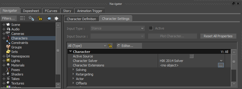 A Character asset is added in the Navigator window Scene browser. The Definition settings for this Character asset are displayed in the Navigator window Definition Settings pane.