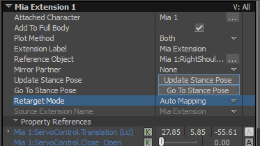 Auto Mapping, MotionBuilder detects the best match source joint on the source character that the extension is connected to, and then automatically maps the animation to the same joint of the target extension. Manual Assign lets you select Transformation values from the source character to use as reference for the target character's extension.