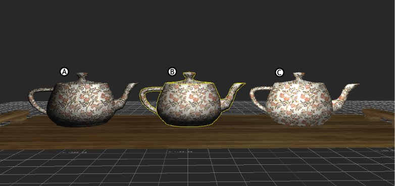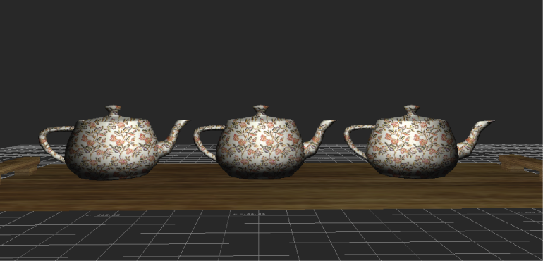 In the following figure, three teapots are arranged on a tray. Materials with textures have been applied to all objects in the scene; a floral pattern for the teapots and a wood texture for the tray.