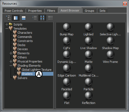 In the Asset browser’s Shading Elements folder, the Shaders folder contains shaders that you can add to a scene. When you drop a shader on an object, you assign values that control the way the model’s surface interacts with the lighting in the scene, creating color, specularity, reflection, transparency, shadowing, and refraction effects.