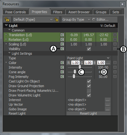 Property settings A. Keyframe button B. Animate button C. Sliders D. Value fields