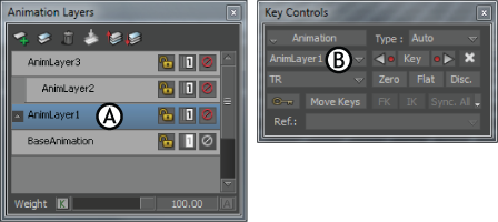 Current layer A. Selected in Animation Layer editor B. Selected in Key Controls window