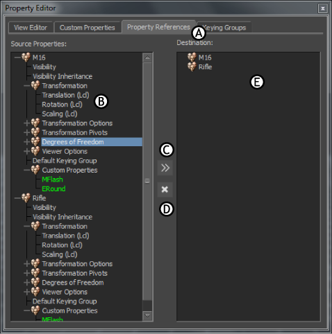 Properties Editor A. Property References pane B. Source Properties area C. Add button D. Remove button E. Destination area